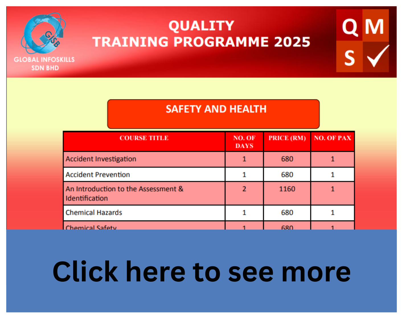 This category contains training about Safety and Health, containing a list of items that ensures the trained person will be able to handle Safety and Health issue properly, like Safety Audit, proper handling of various Hazard, be able to administer First Aid & CPR, Safety Handling Forklift, Proper Hygiene Practices, OHSAS 18000, OHSAS 18001 and more.